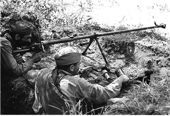 Бронебойщики Гулия и Г. Линартия на переднем крае обороны на южной окраине Краснодара (август 1942 г.) (ЦГАКФД №0157720)