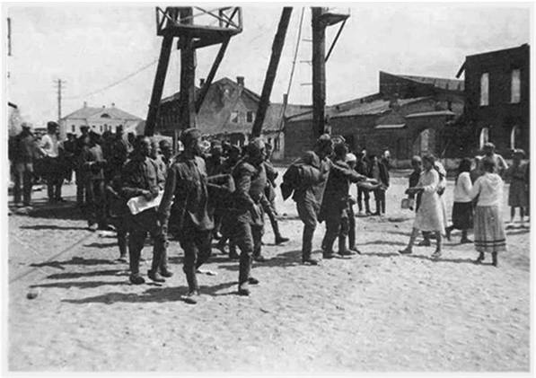 По тротуарам с обеих сторон шли немецкие солдаты с автоматами, висевшими на груди, и с немецкими овчарками на поводках. В надежде увидеть когото из родных или знакомых специально к «прогону» пленных приходили женщины, ещё не потерявшие веру в чудо увидеть родного человека, просились зайти во дворы. Окриками и лаем собак немцы загоняли во дворы всех вышедших из калиток. В щели заборов жильцы и женщиныпросительницы вглядывались в проходившие колонны… Пленных гоняли, как сказали бы военные, «коробками», человек по сто в каждой, рядов 12–15 по 6–8 человек. Гнали подальше от тротуаров, посередине улицы. Каждую такую «коробку» с обеих сторон, спереди и сзади сопровождали «добровольцы» – бывшие пленные, перешедшие на сторону врага. Они были одеты в немецкую форму. Отличались они от оккупантов только тем, что носили белые повязки с надписью «хиви» – «добровольные помощники». Оружие немцы им не доверяли, разрешая пользоваться только армейскими плеткамии и дубинами. Имито и гоняли пленных.