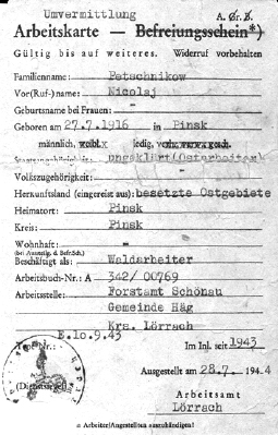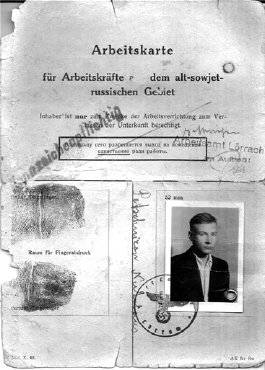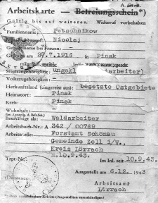 Сказки о счастливой жизни на чужбине закончились с того часа, когда «поезда счастья» пересекали границу Германии. Нет, их не направляли в концентрационные лагеря, они были обязаны зарегистрироваться на биржах труда и получить направление на рабский труд. Каждому восточному рабочему выдавалась рабочая книжка особого образца, куда наклеивались записи о прикреплении работника к тому или иному хозяину или предприятию. Любопытна одна из рабочих карточек восточных рабочих: