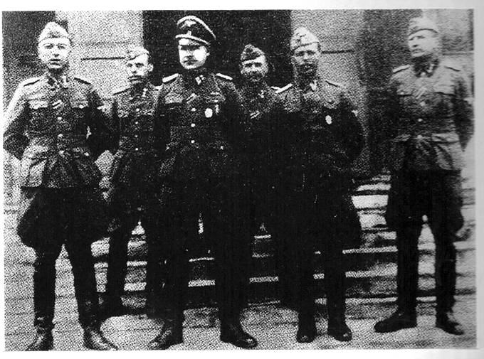 Командование зондеркоманды СС 10А (в центре – оберштурмбаннфюрер Курт Кристман, крайний слева – унтерштурмбаннфюрер Герц Юргенсен [Юрьев]). С точки зрения психологии можно сделать вывод, что стойка и манера держаться запечатленных на этом кадре лиц говорят о том, что немецкие палачи осознавали свою безнаказанность и превосходство над другими людьми и упивались этим (фото ГАКК)