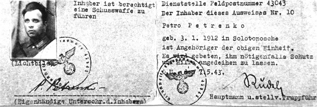 «…Расстрел военнопленных возглавлял немец, офицер, лет 40–45. Роста он был среднего, коренаст, широк в плечах, крепкого телосложения. Широкое лицо, тяжелая нижняя челюсть. В его движениях и взгляде было чтото звериное. В моей памяти этот человек остался как самый страшный из всех виденных мной палачей. В этот день нас было выставлено больше обычного. Как правило, на душегубку выставлялось человек 4–6, а здесь была организована вся команда, все принадлежащие ей машины. Кроме того, были выставлены машины и люди из немецких войсковых частей. Как только оцепление было выставлено, военнопленным приказали вылезти из машин и садиться в одном месте, метрах в пятидесяти от ямы… Мне кажется, что офицер, командовавший операцией, делал это, чтобы насладиться муками людей, которым надо было проходить такой большой путь к смерти. Приказали проходить по одному. Расстрел начался. Обреченные по одному, кто медленно, кто бегом, подходили и становились по колено в воду в ров. Офицер не торопился. Он даже указывал рукой, где стоять. Стрелял одиночными выстрелами в затылок, трупы падали в воду, мутная вода окрашивалась кровью. Так прошло примерно около 15–20 человек. Военнопленные уже стали без команды подбегать по два и по три человека сразу. Еще стоявшие на коленях не были расстреляны, как подбегали новые, поэтому некоторые успели упасть в воду, не замеченные палачом. В это время один из военнопленных, дойдя до ямы, не прыгнул в нее, а пробежал сзади офицера, перескочил через насыпь и скрылся в винограднике. Увидев это, палач зарычал, посмотрел на нас и побежал следом за ним. В эту минуту, когда расстрел временно прекратился, из ямы на другую сторону рва стал вылезать человек. Ктото крикнул: «Стреляй!»; я вскинул винтовку и выстрелил в этого человека. Он осунулся и упал в ров…