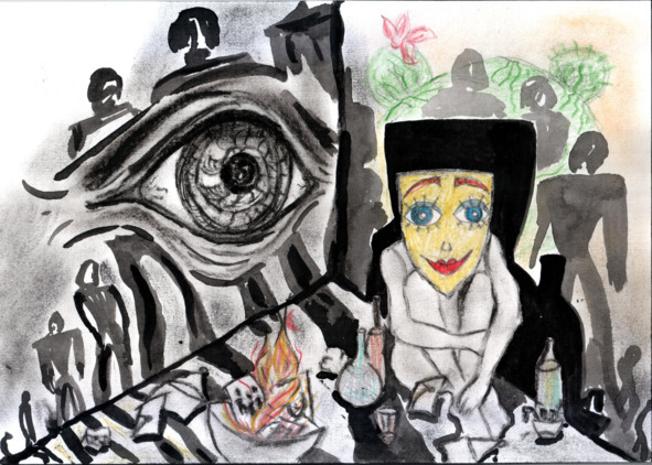 На моем примере – это темные стороны меня, смотрящие на мир с осуждением, насмешкой и даже звериным оскалом, которые возможно родились уже вместе со мной и моей личностью, но были глубоко загнаны духовным поиском. А все что загнано вглубь, в бессознательное – становится только сильней. Поэтому, я хочу выпустить это на свет. Чтобы оно, такое мрачное и грубое, не управляло мной и моим миром, не вырывалось и не проецировалось на кого-то жаждой борьбы за праведность саркастическим осуждением, а просто было, прозрачной темной глубиной голубого озера со спокойной поверхностью…