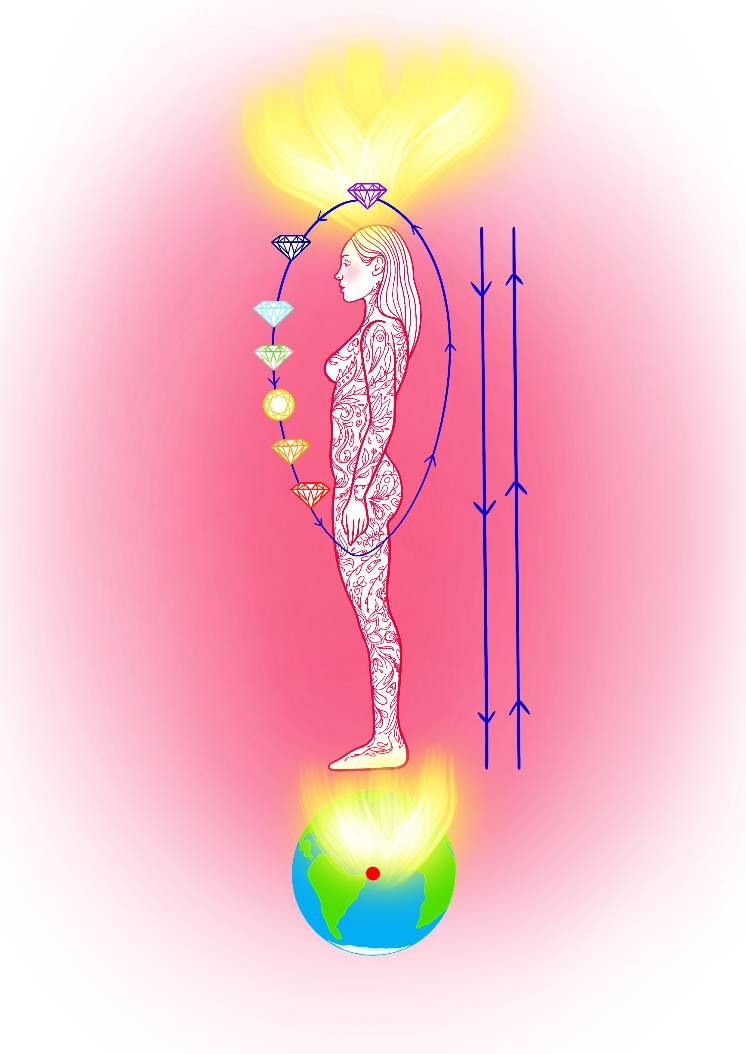 Посмотрите на изображение. Вокруг человека нарисован круг. Этот круг проходит по энергетической системе. Его начало с солнечного сплетения спускается вниз к сакральному центру, достигает корневого, поднимается по позвоночному столбу вверх, активирует пророческий. Затем энергия спускается вниз, активирует центр третьего глаза, горловой. Замыкается круг на сердечном. Именно таким образом мы будем шаг за шагом проходить все центры нашей энергоструктуры, при этом раскрывая в себе интуитивное видение.