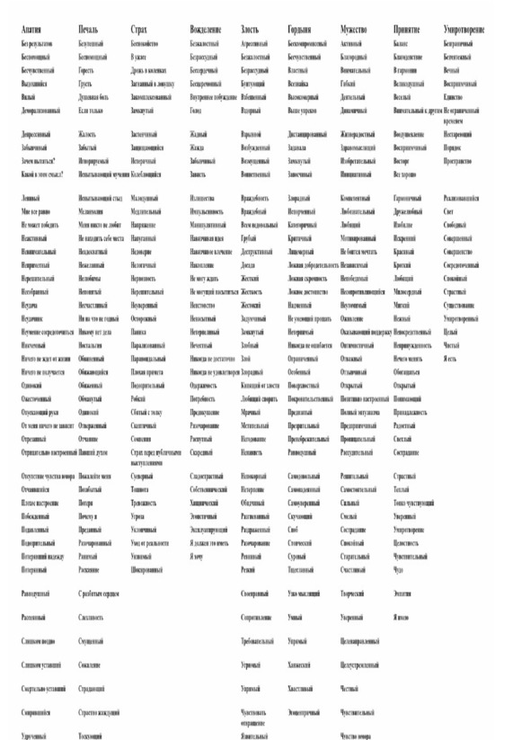 Это основные пять групп эмоций. Разобраться со множеством оттенков эмоциональных состояний мне очень помогла таблица из книги «Метод Седоны», автор Гейл Двоскин.