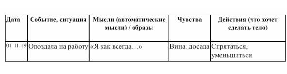 Когда буквы складываются в слова, происходит нечто волшебное. Ты становишься творцом! Это действительно так. Потому что минуту назад этот лист был бел. Что еще важно, это возвращаться к написанному, анализировать, ценить эту информацию, так как это написала ты, здесь точно важно каждое слово! Это ресурс для самопомощи! Сравнивай свои чувства, анализируй. Я пользуюсь дневником, когда в какой-либо ситуации эмоций слишком много или когда наблюдаю в себе неконструктивные страхи. Он очень эффективен на начальном этапе, когда в чувствах путаница, хотя до сих пор это мой любимый инструмент. Дневник чувств выглядит так: