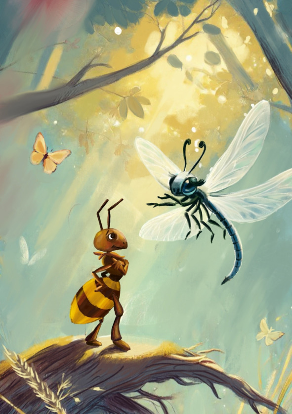 – Я много работаю, создаю продуктов непочатый край, поддерживаю порядок в собственной колонии муравьев, – говорит Муравей. – И в первую очередь, я всегда думаю об общественном благе, а не о личном интересе. От меня гораздо больше пользы! Это только ты, Стрекоза, летаешь без всякого толку туда-сюда, лишь отвлекаешь жителей нашего Честного Королевства на разную ерунду.