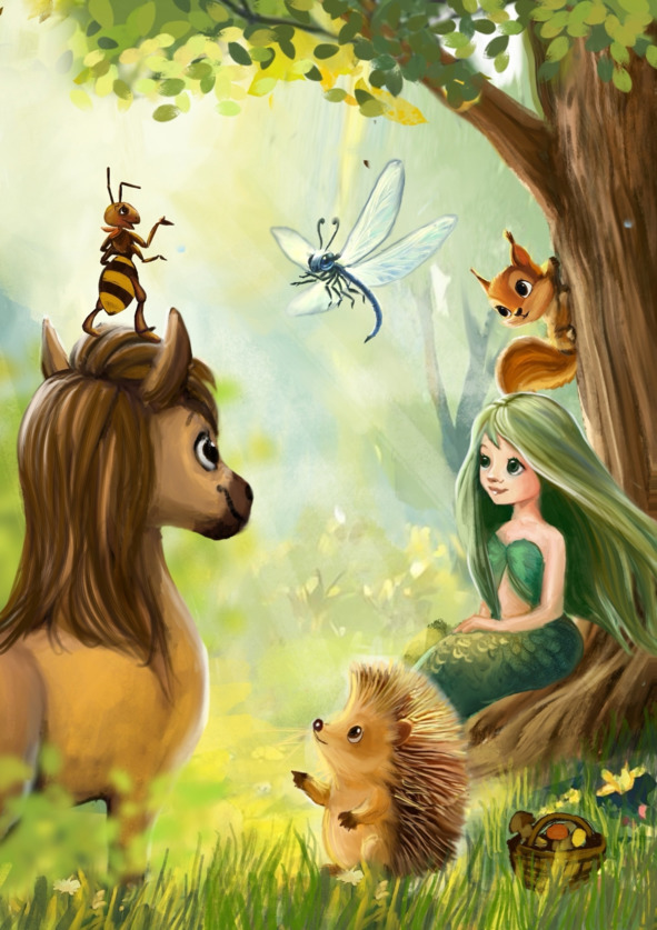 В этот момент галопом прискакала Лошадь с золотистой гривой. На её спине, как настоящая наездница, восседала красавица Русалка. Её нежные серебристые кудри выбились из прически, а длинный рыбий хвост для удобства был привязан к седлу. Русалка обвела присутствующих своими синими бездонными глазами, и все замерли от этого чарующего взгляда. Даже Дерево на какое-то мгновение перестало шелестеть своей листвой.