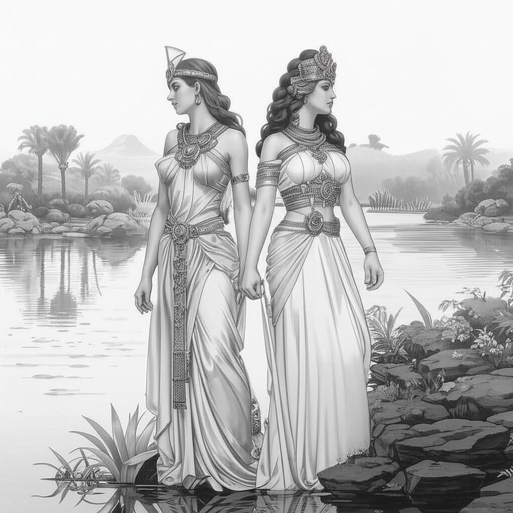 Солнце тихо опускалось за горизонт, окрашивая небо в нежные теплые тона. Подруги Исис и Татат сели у берега Нила. Дул легкий ветерок, который нес с собой аромат цветущих лотосов. Вода медленно колыхалась, отражая в себе огонь заката, словно подчеркивая важность момента.