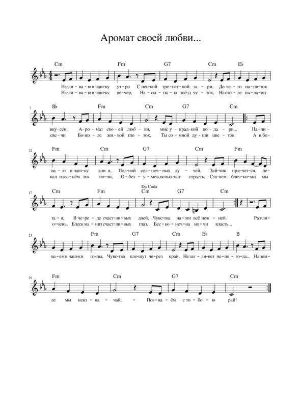 Наливаю в чашку утроС пенкой трепетной зари,До чего напиток вкусен,Аромат своей любви,Мне украдкой подари…Наливаю в чашку дни я,Полной солнечных лучей,Зайчик прячется летая,В череде счастливых дней,Чувства наши все нежней.Наливаю в чашку вечер,Насыпаю звезд чуток,На столе пылают свечиБожоле живой глоток,Ты со мной, души цветок.А в бокал плеснем мы ночи,Обезумев, вспыхнет страсть,Станем близкими мы очень,Блеск манит счастливых глаз,Бесконечна ночи власть…Разливаем в чашки годы,Чувства плещут через край,Не заглянет непогода…На Земле мы невзначай, —Познаем с тобою рай!