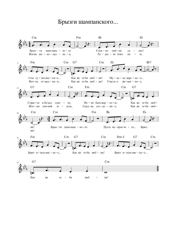 Брызги шампанского,Словно любви салют!Сны хулиганские…Как же тебя люблю…Музыка царская…Страсти в бокал плесну,Ночи быть жаркою,Как же тебя люблю…Жизнь шоколадная,Радости блюз пою,Ночка отрадная…Как же тебя люблю!Счастье желанное,Жизни земной юдоль,Сердца создание,Как же тебя люблю!Брызги шампанского,Пусть не простого… Брют,Брют итальянское…Как же тебя люблю!22 октября 2017 год, Новосибирск