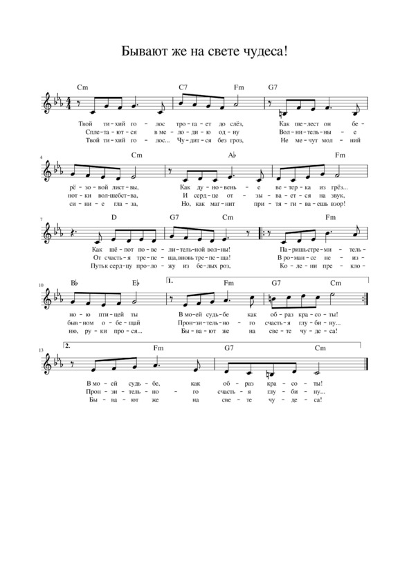 Твой тихий голос трогает до слез,Как шелест он берёзовой листвы,Как дуновенье ветерка из грёз…Как шёпот повелительной волны!Паришь стремительною птицей ты,В моей судьбе, как образ красоты!Сплетаются в мелодию однуВолнительные нотки волшебства,И сердце отзывается на звук,От счастья трепеща, вновь трепеща!В романсе неизбывном обещайПронзительного счастья глубину…Твой тихий голос… Чудится без гроз,Не мечут молний синие глаза,Но, как магнит притягиваешь взор!Путь к сердцу проложу из белых роз,Колени преклоню, руки прося…Бывают же на свете чудеса!22 мая 2017 год, Новосибирск