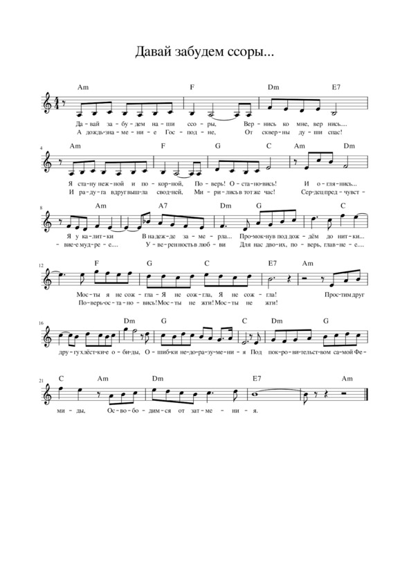 Давай забудем наши ссоры,Вернись ко мне, вернись…Я стану нежной и покорной,Поверь! Остановись!И оглянись… Я у калиткиВ надежде замерла…Промокнув под дождём до нитки…Мосты я не сожгла —Я не сожгла,Я не сожгла!Припев:Простим друг другу хлёсткие обиды,Ошибки, недоразумения,Под покровительством самой Фемиды,Освободимся от затмения.А дождь – знамение Господне,От скверны души спас!И радуга вдруг вышла сводней,Мирились в тот же час!Сердец предчувствие мудрее…Уверенность в любвиДля нас двоих, поверь, главнее…Поверь – остановись!Мосты не жги!Мосты не жги!6 февраля 2017 год, Новосибирск
