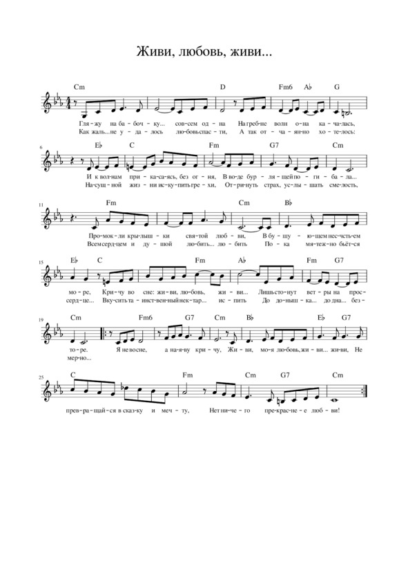 Гляжу на бабочку… совсем однаНа гребне волн она качалась,И к вОлнам прикасаясь, без огняВ воде бурлящей погибала…Промокли крылышки святой любви,В бушующем несчастьем море,Кричу во сне: живи, любовь, живи…Лишь стонут ветры на просторе.Припев:Я не во сне, а наяву кричу,Живи, моя любовь… живи… живи,Не превращайся в сказку и мечту,Нет ничего прекраснее любви!Как жаль… не удалось любовь спасти,А так отчаянно хотелось:Насущной жизни искупить грехи,Отринуть страх, услышать смелость,Всем сердцем и душой любить… любитьПока мятежно бьется сердце…Души таинственной нектар… испитьДо донышка… до дна… бессмертной..Припев.10 сентября 2018 год, Новосибирск