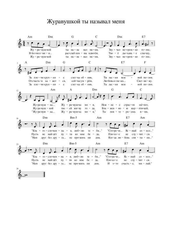 Журавушкой ты называл меня,Звучал негромко голос,За плечи хрупкие слегка обняв,Ты ласки нежной полон.Журавушка …Журавушка моя,Нежнее страсти шёпот, —«Благословенная, люблю тебя…»«Сгораю… Ясный сокол…»В безмолвии… расслаблены вдвоём,Твое дыханье слышу,От счастья, кажется, сейчас умрём,Любовь в глазах… свет вижу.Журавушкой твоей живу года,Блаженною жар-птицей,Пусть не найдёт пути ко мне беда,Плохое не случится.Журавушкой ты называл меня,Звучал негромко голос,За плечи хрупкие обняв,Ты ласки нежной полон:«Журавушка… Журавушка моя», —Ты повторяешь имя,«Нам друг без друга… не прожить ни дня,Когда любовь святыня»…«Нам друг без друга… не прожить ни дняИ это счастье, милый».
