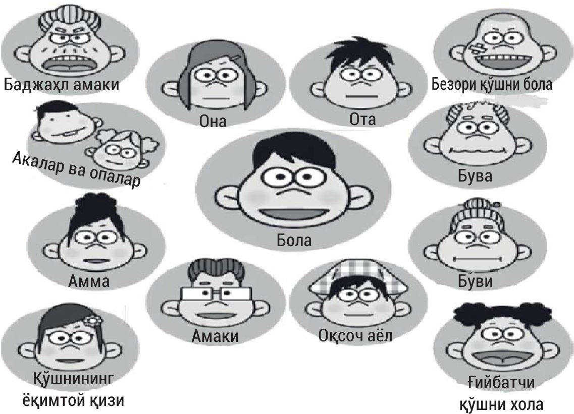 Бува ва бувиларнинг ўз роллари бор, улар оналарнинг жаҳли чиққанда, болани авайлашади, бошини силашади. Амаки ва аммаларнинг ҳам ўз роли бор, улар « сен билан кўришмаганимиздан буён шунча улғайиб кетибсан-ку!», дея болаларни объектив баҳолайдилар.