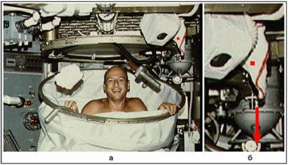 Автор книги обосновано считает, что фотографии, сделанные клоунами НАСА можно сделать на Земле. Попов А. И. полагает, что на этих снимках имеются признаки наличия земно гравитации. Попов А. И.: «Илл.3. Тряпочка провисла под действием силы тяжести. (Душ в „Скайлэбе“). Но ведь точно так же эта сцена выглядела бы и на Земле. Сомнение усиливает отмеченная красной меткой тряпочка, которая видна в правом верхнем углу снимка. Она обвисла строго по вертикали, как будто на неё действует сила веса. А как эта сила „пробралась“ на орбитальную станцию, где должна царить невесомость?». [1]