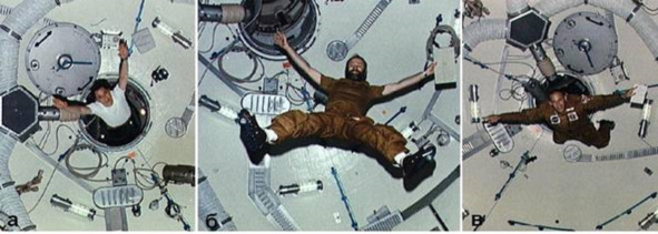 Бесспорно эти фотографии можно выполнить и на Земле. Но американские пропагандисты, защитники НАСА на подобную аргументацию показывают ссылки на видеоматериалы, где «космонавты» этого шоу порхают туда сюда в пространстве, демонстрируя невесомость. Что касается тряпочки в душе, которая принимает строго вертикальное положение. Подобное расположение материи в один миг может появится на кадре и в состоянии невесомости. Этот снимок не доказывает наличие гравитации. Хотя основания для подозрения появляются. Для обнаружения признаков фальсификации этой программы необходимо смотреть ситуацию в движении, на телевизионных кадрах. Сам автор справедливо отметил, что сцены невесомости можно сделать в самолете нулевой гравитации. При правильном тщательном монтаже можно получить сцены невесомости более одной минуты до 5—10 минут «трансляции». Это доказывают художественные фильмы про серии шоу «Аполлон». Актеры снимали сцены демонстрации невесомости в указанном самолете, где такое состояние появлялось при выполнении параболы Кеплера. Попов А. И.: «Такие клипы о невесомости можно снять в самолёте. На сайтах и в фильмах НАСА можно найти до двух десятков отдельных клипов или эпизодов, встроенных в фильмы, на которых астронавты «Скайлэба» действительно демонстрируют невесомость [3]. На илл.6а показан кадр из одного такого клипа.