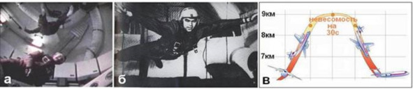 Автор: «Илл.6. Астронавты и космонавты демонстрируют невесомость: а) астронавты демонстрируют невесомость якобы в «Скайлэбе»; б) советский космонавт в самолёте-тренажёре в те же годы; в) схема достижения невесомости в самолёте-тренажёре. Просмотр клипов на тему невесомости в «Скайлэбе» показывает, все эпизоды о невесомости, якобы снятые в «Скайлэбе», очень кратковременны. Их средняя продолжительность – 10 секунд. А когда встречаются более длительные клипы, то они состоят из набора отдельных коротких сцен. Зачем же так спешили астронавты-кинооператоры, если в настоящей космической станции невесомость – «вещь» постоянная, и при её съёмках спешить некуда. Возникает предположение о том, что все эти короткие клипы сняты не в космосе, а в известном всем космонавтам самолёте – тренажёре (илл.6в). Для достижения в салоне кратковременного состояния невесомости такой самолёт разгоняется вверх и, продолжая двигаться по инерции, делает «горку», а затем начинает падать вниз [4]. В короткие секунды прохождения «горки» в салоне самолёта наступает состояние, близкое к невесомости. Оно было бы идеальным, если бы внешний воздух не тормозил падение самолёта. Пилот самолёта старается с помощью работы двигателей возможно точнее скомпенсировать это торможение. После прохождения горки самолёт не может долго падать, иначе он не успеет выйти из пике. Характерная длительность невесомости в самолёте составляет около 30 секунд (при определённом риске она может быть немного увеличена). Самолёты – тренажёры использовались с самых первых лет пилотируемой космонавтики. На илл.6в мы видим космонавта А. Николаева, парящего в невесомости в самолёте в те самые годы, о которых идёт речь в этой книге. Поэтому НАСА вполне могла снять на десяток – другой секунд кувыркание в невесомости внутри такого самолёта, а затем представить его, как акробатические упражнения якобы внутри космической станции (илл.6а). Воспроизвести интерьер станции в салоне самолёта – тренажёра технических трудностей не составляет. Размер его салона для этого вполне достаточен. Достаточно сказать, что в наши самолёты закладывались целые макеты кораблей «Союз», а космонавты парили вокруг них, тренируя выходы в открытый космос». [1] Такие тренировки были в США и СССР.