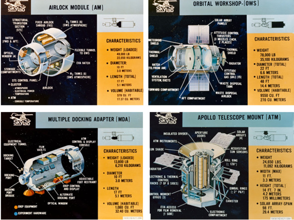 Официальная сказка НАСА: «Скайлэб была построена на основе корпуса верхней ступени ракеты Сатурн-1Б. Корпус был покрыт теплоизоляцией, внутреннее пространство баков было приспособлено для жизни и научных исследований. В верхней части корпуса были установлены отсек оборудования, шлюзовая камера с основным осевым и резервным боковым стыковочным узлами длиной 5,28 м и диаметром 3,0 м. К этому отсеку прикреплен другой массивный отсек астрофизических научных приборов ATM (Apollo Telescope Mount). После выхода на орбиту ATM поворачивался на 90°, открывая доступ к осевому стыковочному узлу. Пустой водородный бак ступени образует орбитальный блок станции внутренним диаметром 6,6 м, разгороженный решетчатыми перегородками на лабораторный (ЛО) и бытовой (БО) отсеки и высотой 6 м и 2 м. Кислородный бак служит для сбора отходов. ЛО служит для проведения научных экспериментов, БО – для отдыха, приготовления и приёма пищи, сна и личной гигиены. Все необходимое для деятельности трёх экипажей находится на «Скайлэб» во время её запуска: 907 кг продуктов и 2722 кг воды. Система электроснабжения станции состоит из шести панелей солнечных батарей (СБ): основных, развертывающихся на корпусе в виде двух больших крыльев, и четырёх раскрывающихся крестообразно на блоке АТМ. Внешняя длина комплекса «Скайлэб» с пристыкованным к ней транспортным кораблем Аполлон – 36 м, масса – 91,1 т. В жилых отсеках общим объёмом 352,4 м³ поддерживается искусственная кислородно-азотная атмосфера (74% кислорода и 26% азота) давлением 0,35 атм и температурой 21—32° C.