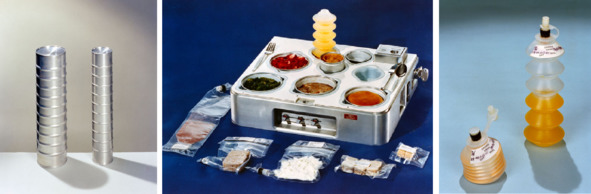Фотография НАСА, слева: «S70—16743 (1970) Крупным планом отсек для измерения консервной банки Skylab. Один слева представляет 11 банок для еды определенного размера. Меньшие банки для еды представлены справа». [12] Фотография НАСА, в центре: «S72—15409 (1972) Крупный план подноса для еды, который планируется использовать в программе Skylab. Несколько пакетов космической еды лежат рядом с подносом. Пища в лотке готова к употреблению. Вне лотка, начиная с нижнего левого угла: виноградный напиток, говяжья вырезка, курица и рис, бутерброды с говядиной и кусочки сахарного печенья. В лотке сзади слева: апельсиновый напиток, клубника, спаржа, ребро, обеденный рулет и пудинг из ириски в центре». [13]