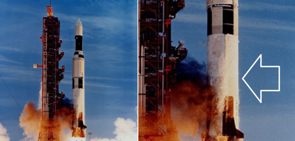 Указатели со словами «RINGS» (Кольца) показывают соприкосновение огромного бака с внутренними стенками цилиндра ступени. По всей видимости, это места крепления бака, перегороженного на две части с жидким водородом и жидким кислородом, если верить сказкам НАСА. Схема второй ступени ракеты «Сатурн-1Б» совпадает с о схемой ступени ракеты третьей ступени ракеты «Сатурн-5» S-IVВ. Поэтому для описания второй ступени «С-1В» используется информация о конструкции третьей ступени ракеты «С-5». Конечно же многие зрители отметили необычный момент перед самым стартом на поверхности ракеты «Сатурн-5». Первая ступень конструкции после полной заправки покрылась толстым слоем льда в том месте, где, по версии НАСА, находился бак с жидким кислородом. Но 2 и 3 ступени ракеты не подверглись обледенению. Хотя именно том, согласно мифологии обманщиков, были установлены баки с жидким водородом и жидким кислородом.
