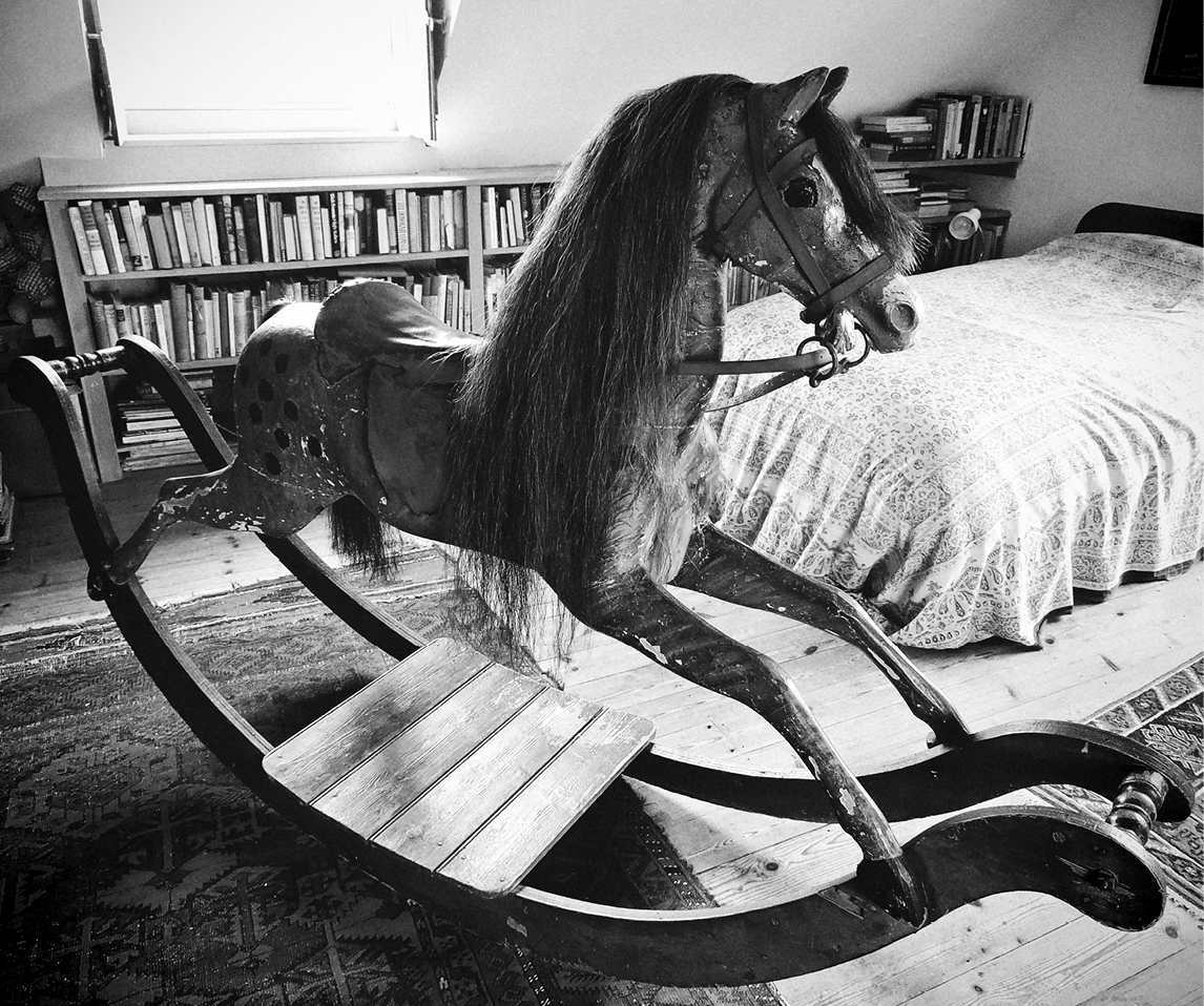 We climb the narrow staircase that leads to the attic. The room at the top is dominated by a black-maned wooden rocking horse, conjuring for me the opening credits of the television series in which the camera circles the horse in close-up while the woodwinds, violins and harp of the main theme swirl in accompaniment.§§ This is the bedroom in which Tolly sleeps, and is a near facsimile of the one described in the text. As the two of us stand there and Diana recounts details of the furniture, something odd happens. A hardback novel with no dust jacket seems to propel itself, with considerable energy, onto the floorboards from the low, built-in bookcase on the wall behind the horse. Her little brown terrier, who has been following us on the tour, saunters across and sniffs it.