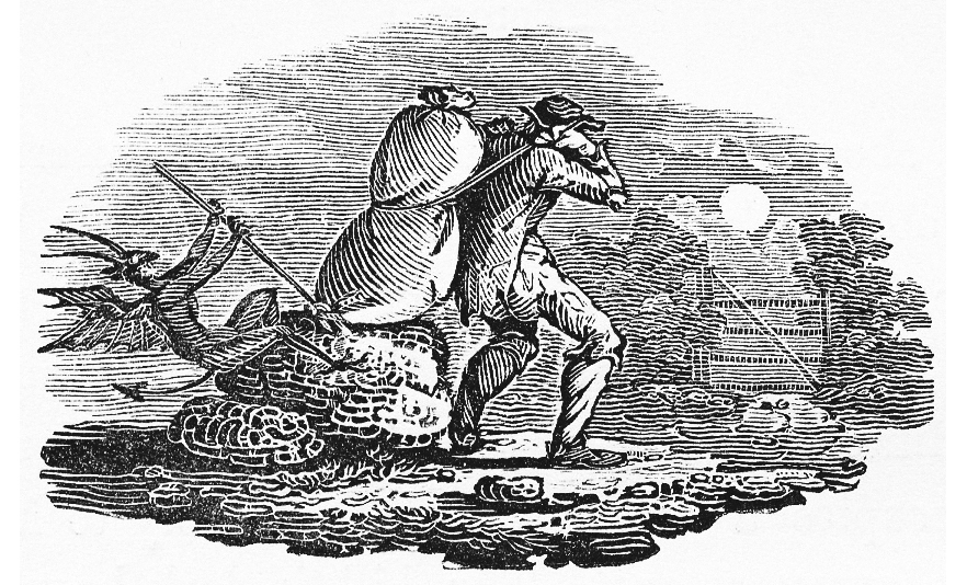 Thomas Bewick, the eighteenth-century illustrator and author of the landmark History of British Birds, whose surname is commemorated by those squat-necked Arctic swans we would watch feeding on potatoes on the floodlit washes, also features tangentially in M. R. James’s story ‘Casting the Runes’. A victim of the story’s black-magic curse is sent in the post one of Bewick’s woodcuts that ‘shows a moonlit road and a man walking along it, followed by an awful demon creature’. If he has not concocted his own work by Bewick, James is most likely referring to the same tailpiece vignette that so disturbs the young Jane Eyre in Charlotte Brontë’s novel – a tiny extraneous illustration tucked into the blank space at the end of the 1804 ornithological tome’s chapter on the black-throated diver.* According to Brontë’s heroine, Bewick’s terrifying etching depicts a ‘fiend pinning down the thief’s pack’. And though there’s nothing that necessarily identifies the man as a law-breaker, the act of carting a heavy bag down a dark country lane does seem suspicious; the attached medieval-looking winged devil that’s doing its best to pry open the contents of the sack does little to assuage our suspicions that the bearer has been up to no good and is getting his hellish comeuppance.