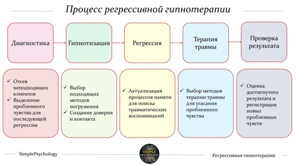 – Регрессия: актуализация процесса свободных ассоциаций и воспоминаний для поиска травмы. После наведения транса наша работа состоит в актуализации воспоминаний клиента путем применения техники регрессии. Чем выше гипнабельность, тем более директивные техники регрессии мы можем использовать.