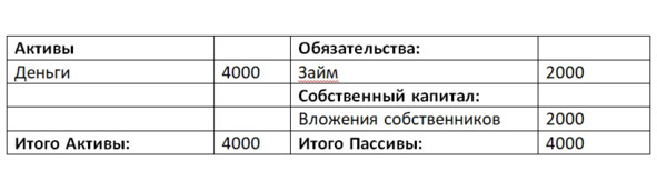 В отчете мы видим, что компания располагает Активом на $4000, который сформирован из собственных средств $2000 и сторонних обязательств $2000.