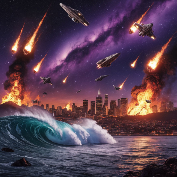 Всё же, меня тоже подбивают, и мы, вместе с бортовым компьютером, выбираем оптимальный путь для снижения на Землю. Надеюсь, до аэродрома дотянем. Тут я только стал замечать, что, по всей Земле, бегают какие-то фиолетовые волны, а над самыми крупными городами, открыты огромные порталы, из которых столпом хлещет вода, затапливая всё вокруг.