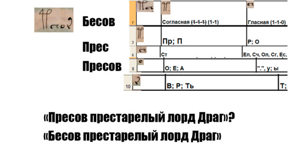 Как видно из примера, слово: «Прессов» не подходит по смыслу с остальными словами, поэтому меняем первый символ на другую согласную «Б». Выходит, понятное выражение: «Бесов престарелый лорд Драг»