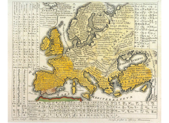 Ниже представлена лингвистическая карта 1741 года, где на каждой территории был пример письма, использовавшийся в то время.
