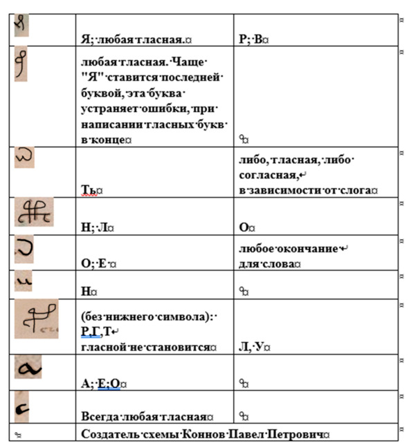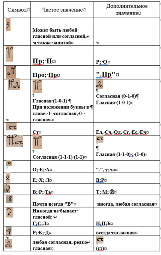 В ниже приведённой таблице имеется «частое значение» символа и «дополнительное значение». А также есть и незатронутые варианты значения букв, читаемые только человеческой логикой, способной отменить значения букв в таблице. Таким образом, чтение манускрипта становится «интуитивно-логическим», где каждое последующее слово оправдывает предыдущее в логической цепочке смысла.