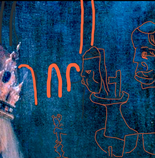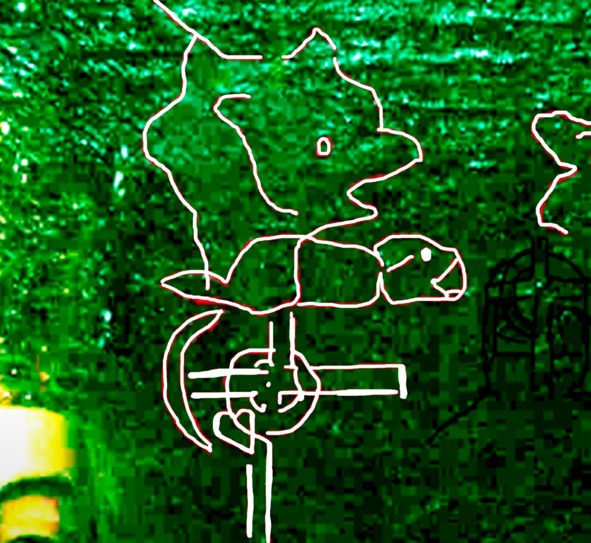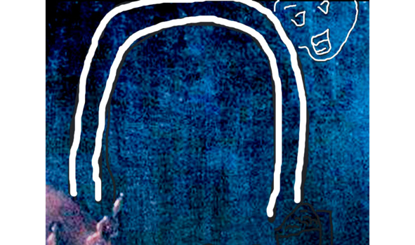 Слева от Милославской стоит бородатый священник, возможно, что это иезуит Томаш Перейра -Иезуит, посетивший Россию (рис.53). Над ним лось, а также очертания лося, плавно перетекают в очертания жирафа на колёсах, подключённого к мотору металлической полоской. Видимо этот жираф двигался по кругу, вокруг этого куба, как механическая игрушка. Т. е. Мария Милославская стоит позади картины, где каждый рисунок является составной частью другого рисунка, как у Октавио Окампо, но я вижу только отдельные вещи (рис.54).