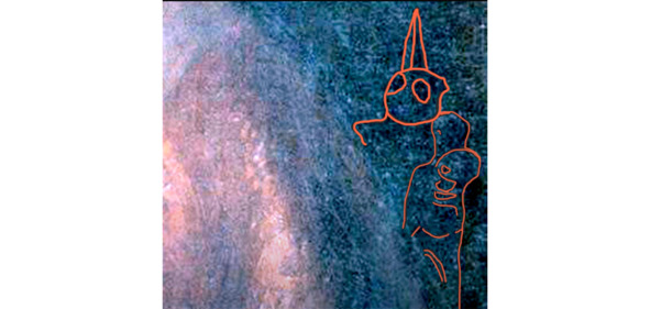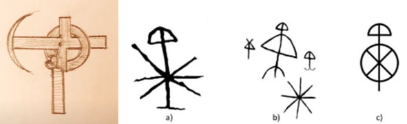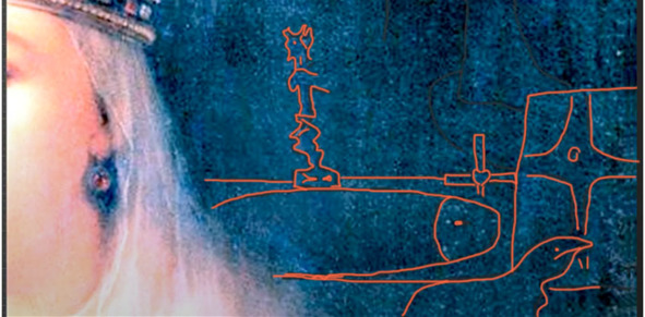 Рис.50 Слева – изображение необычного креста (прорисовка Павла Коннова) на картине. Справа Рис.50.1 – приближенные к нему изображения из музея валунов в Уручье, прорисовка Дмитрия Кириенко. {14}