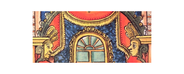 В официальной истории сохранилось изображение масок на стенах и книги, лежащей на столе: Картина: Никита Зотов обучает Петра Великого (рис.45). Если присмотреться к картинке, обучение Петра происходит так же в ведическом храме, поэтому на стыке стен с потолком изображены лица (рис. 46), тогда как в России давно уже Христианское Правоверие. В России на тот момент не должно было оставаться языческих храмов, к тому же, академическая наука считает, что ведические язычники не имели храмов, а молились у кумиров на природе. Книга, лежащая на столах – это Библия.