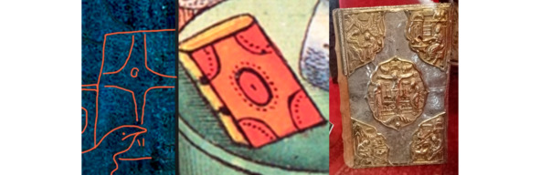 Между масками стоит раковина (чаша) с краном. За маской, арочный свод с ещё одной маской (рис.42) и арочные окна (рис.40). На переднем плане, относительно заднего фона, находится стол, на котором стоит статуэтка, книга с крестом, крест с сердцем по средине, рыба или поднос и статуэтка животного (рис. 43).