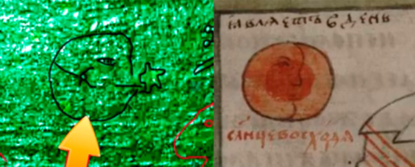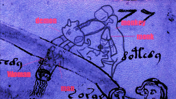 В Манускрипте Войнича есть так же замазанное изображение (рис.55). На нём присутствует монахиня в клобуке с крестом в круге, и обезьяна, призывают или прогоняют водяного. Водяного всегда изображали с рогом на голове и верхом на рыбе. Сом был его конём. Монахиней (по официальной истории), видимо, была Евдокия Лопухина, т.к. на картине похожий крест, как у Марии Милославской (рис.47). Возможно, что обезьяна была помощником в ритуале, т.к. в Индии сохранилось много храмов обезьян. Монах по-английски Monk, а обкзьяна Monkey, т.е в древности они были близки. А многих славянских Богов относили к демонам, туда же и отнесли водяного. Получается на картинке трое персонажей с корнем «mon»: deMON, MONk, MONkey.