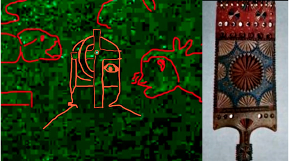 Рис.49. Слева изображение воина с крестом и полукругом сбоку, справа изображение прялки, 1920 год, Нюксенский район Волгоградской обл. из книги И. Я. Богуславской, «Добрых рук мастерство».