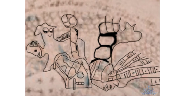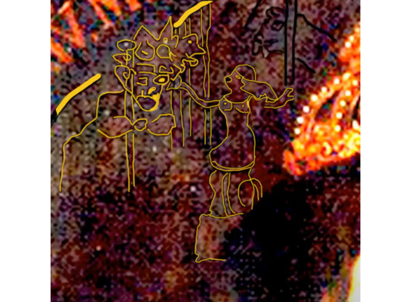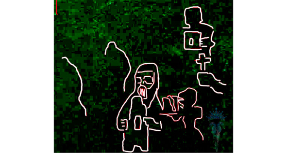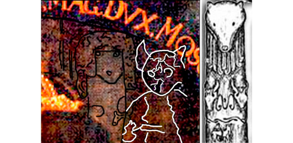 На следующем замазанном рисунке Алексей Михайлович Романов. В начальном контрасте сразу виден кумир собаки или волка, на самом деле это изображение Велеса в образе медведя. Рядом с Велесом кумир лиса. Как известно из Чаромутного перевода «Руслана и Людмилы» – славяне – это род лис. На рисунке, лис состоит из маленьких изображений лисов, нанесённых на него.