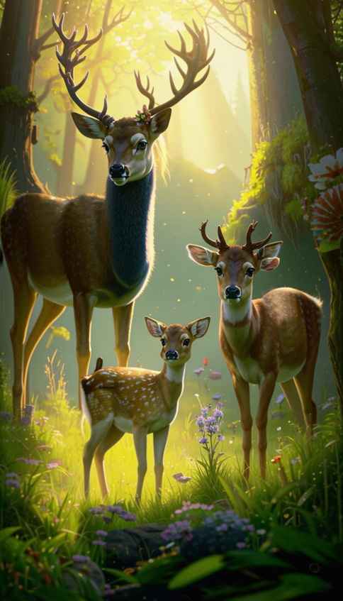 На следующий день отец с сыном опять пошли на это место понаблюдать за величественным красавцем. Уж больно любопытно было посмотреть на оленя с золотыми рогами. Незаметно подойдя и притаившись в кустах около зелёного лужка, они затаились. Через полчаса появился величественный красавец – благородный олень, гордо неся на голове золотую корону из оленьих ветвей. За ним следовала косуля и маленький оленёнок с необычайным окрасом. В нём сочеталось сразу несколько мастей: сивая (серая), бурая (коричнево-рыжая от отца) и каурая (красно-рыжая от матери). Как подметил отец: