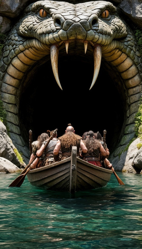 Добравшись, гномы принялись рыть новый туннель в направлении пасти великого змея, повинуясь совету мудрого старца. Снаружи же, словно крадущаяся тень, вода просачивалась в подземелье, грозя затопить его полностью. С каждой минутой её становилось всё больше и больше. Вчера она была гномам по колено, сегодня – уже по пояс. Отчаявшиеся путники вскочили в лодки, рассекая вёслами хмурую гладь. Передовой отряд горнопроходчиков, обливаясь потом, работал на пределе сил, но стихия не утихала. Вода затопила туннель уже больше чем наполовину. Сидя в утлых челнах, гномы головами задевали свод прохода, судорожно цепляясь за выступы, словно пытаясь удержать саму жизнь. Когда надежда угасла, и мрак отчаяния сгустился, в стене разверзся пролом, и яростный поток, словно разъярённый зверь, вышвырнул их в огромную пещеру.