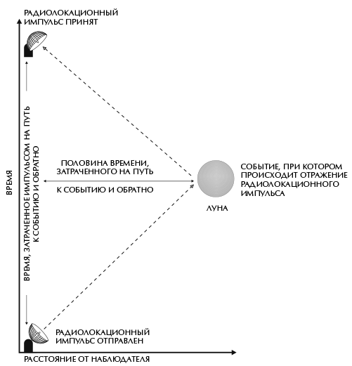 В настоящее время этот метод используется для точного измерения расстояний, потому что время мы умеем измерять точнее, чем длину. Действительно, ведь метр определяется как расстояние, которое свет проходит за 0,000000003335640952 секунды по цезиевым часам. (Это число выбрано, чтобы обеспечить соответствие историческому определению метра как расстояния между двумя метками на платиновом эталоне, который хранится в Париже.) С таким же успехом можно использовать и более удобную единицу длины под названием «световая секунда». Она определяется просто как расстояние, которое свет проходит за одну секунду. В теории относительности расстояния определяются через время и скорость света, и отсюда непосредственно следует, что каждый наблюдатель будет измерять одну и ту же скорость света (эта скорость по определению равна 1 метру в 0,000000003335640952 секунды). При этом нет необходимости вводить понятие эфира, присутствие которого, как показал опыт Майкельсона и Морли, все равно невозможно обнаружить. Но теория относительности требует от нас радикального пересмотра наших представлений о пространстве и времени. Приходится признать, что время не является полностью отделенным и независимым от пространства: они образуют единый объект под названием пространство-время.