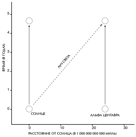 Четыре координаты события удобно представить себе как координаты точки в четырехмерном пространстве под названием «пространство-время». Четырехмерное пространство вообразить невозможно… я с большим трудом представляю себе даже трехмерное! При этом графически изображать двумерные пространства, такие как поверхность Земли, совсем нетрудно. (Поверхность Земли двумерна, потому что положение любой точки на ней можно задать с помощью двух координат – широты и долготы.) На моих графиках, как правило, время увеличивается кверху, а одно из пространственных измерений откладывается по горизонтальной оси. Остальными двумя пространственными измерениями пренебрегаем или – в некоторых случаях – изображаем их в виде перспективы. (Это так называемые пространственно-временные диаграммы – вроде той, что изображена на рисунке 2.1.) Например, на рисунке 2.2 время в годах отложено вдоль вертикальной оси и увеличивается снизу вверх, а расстояние в милях[5] вдоль линии, соединяющей Солнце и Альфу Центавра, отложено по горизонтальной оси. Траектории Солнца и Альфы Центавра в пространстве-времени изображены в виде вертикальных линий слева и справа от графика. Луч света от Солнца движется по диагонали, и ему требуется четыре года, чтобы пройти путь от Солнца до Альфы Центавра.