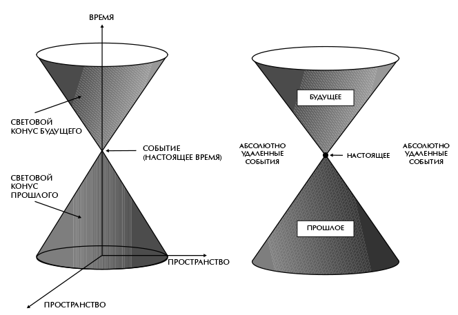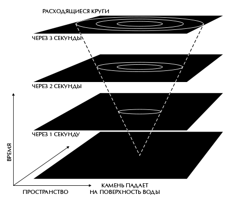 Как мы уже знаем, из уравнений Максвелла следует, что скорость света должна быть всегда одной и той же независимо от скорости источника света, и этот вывод был подтвержден точными измерениями. Отсюда следует, что если импульс света испущен в определенное время и в определенной точке пространства, то со временем он должен распространиться в виде световой сферы, чьи размер и положение не зависят от скорости источника. Через одну миллионную долю секунды свет расширится до сферы радиусом 300 метров, через две миллионных доли секунды радиус сферы составит 600 метров, и т. д. Это напоминает круги, которые расходятся по воде, если в пруд бросить камень. По мере того как проходит время, круг этот расширяется. Если положить друг на друга снимки круга, полученные в разное время, они примут вид конуса, вершина которого совпадает с местом и временем, которые соответствуют месту и времени попадания камня в воду (рис. 2.3). Аналогичным образом распространяющийся от события свет образует (трехмерный) конус в (четырехмерном) пространстве-времени. Этот конус называется световым конусом будущего для этого события. Точно так же можно изобразить и другой конус, называемый световым конусом прошлого, который представляет собой множество событий, световой импульс от которых в принципе мог достичь данного события (рис. 2.4).