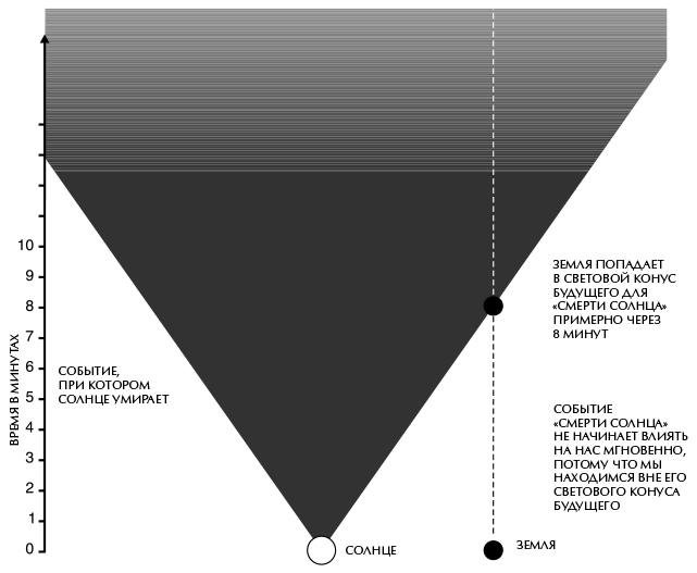 Любое заданное событие P разделяет события Вселенной на три класса. События, до которых из события P можно «добраться» посредством частицы или волны, движущейся со скоростью меньше скорости света или равной ей, называются будущим события P. Они располагаются на излученной событием P расширяющейся световой сфере или внутри этой сферы. Следовательно, на пространственно-временной диаграмме эти события находятся внутри светового конуса будущего для события P или на этом конусе. Событие P может повлиять только на те события, которые находятся в его световом конусе будущего, потому что ничто не может двигаться быстрее света. Аналогично прошлое события P определяется как множество всех событий, из которых можно достичь события P, перемещаясь со скоростью меньше скорости света или равной ей. Это тот набор событий, который может повлиять на то, что происходит в P. События, которые не относятся ни к прошлому, ни к будущему события P, называются абсолютно удаленными от события P (рис. 2.5). То, что происходит при этих событиях, никак не может повлиять на событие P, а событие P, в свою очередь, никак не может повлиять на эти события. Например, если Солнце прямо сейчас погаснет, то это никак не повлияет на события, происходящие в настоящий момент на Земле, потому что эти события будут абсолютно удаленными от «выключения» Солнца (рис. 2.6). Мы узнаем об этом только через восемь минут – столько требуется свету, чтобы преодолеть расстояние от Солнца до нас. Только тогда земные события окажутся внутри светового конуса будущего для события, при котором погасло Солнце. Точно так же мы не знаем, что происходит в настоящий момент на бóльших расстояниях во Вселенной: свет, который доходит до нас из далеких галактик, покинул их миллионы лет назад. В случае самого далекого из наблюдаемых объектов свет, который мы видим, покинул его восемь тысяч миллионов лет назад. Так вот: глядя на Вселенную, мы видим ее такой, какой она была в прошлом.