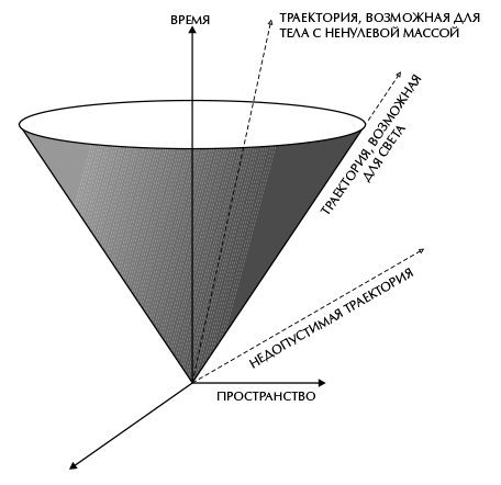 Если пренебречь влиянием тяготения, – как это сделали Эйнштейн и Пуанкаре в 1905 году, – то мы получим то, что называют специальной теорией относительности. Для каждого события в пространстве-времени можно построить световой конус (множество всех лучей света в пространстве-времени, которые могут излучаться при рассматриваемом событии), и, поскольку скорость света одинакова для всех событий и во всех направлениях, все световые конусы одинаковы и направлены в одну и ту же сторону. Теория также говорит, что ничто не может перемещаться быстрее света. Это значит, что траектория любого объекта в пространстве и времени имеет вид линии, расположенной внутри светового конуса (рис. 2.7). Специальная теория относительности успешно объяснила, почему для всех наблюдателей скорость света одинакова (как показал опыт Майкельсона и Морли), и описала, что происходит, когда объект движется со скоростью, близкой к скорости света. Но она противоречила ньютоновской теории тяготения, которая гласит, что тела притягиваются друг к другу с силой, зависящей от расстояния между ними. Это означает, что если сдвинуть одно из тел, то в то же мгновение изменится сила, действующая на второе тело. Или, другими словами, гравитационное воздействие должно распространяться с бесконечно большой скоростью, а не со скоростью меньше скорости света или равной ей, как того требует специальная теория относительности. Между 1908 и 1914 годом Эйнштейн предпринял ряд неудачных попыток построить теорию тяготения, совместимую со специальной теорией относительности. Наконец, в 1915 году он предложил теорию, которая теперь известна как общая теория относительности.