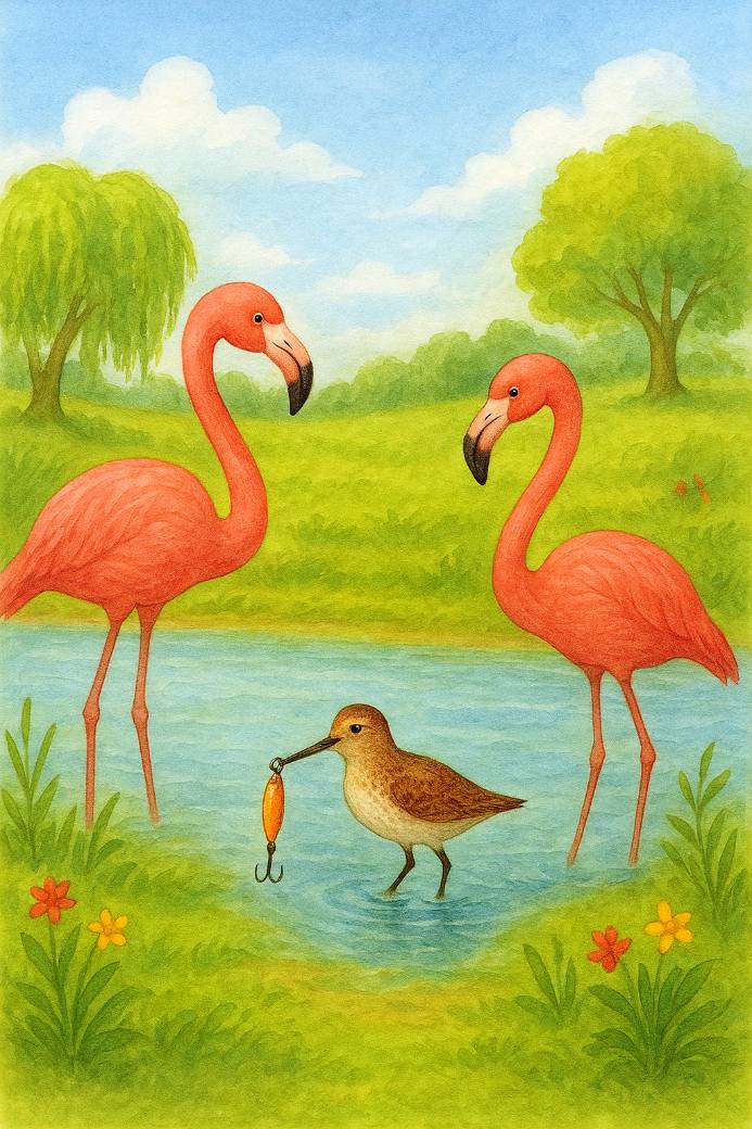 Не знал кулик как спорщиков утихомирить. Но однажды вытащил из воды рыбку, глянул, а не рыбка – это вовсе, а на рыбку очень похожая блесна, потерянная рыбаками. И сообразил кулик, что делать. Взял он блесну и полетел к горе философам. Прилетел, скромненько в сторонке на кочку присел блесну перед собой положил и лапкой незаметно ее шевелит. Издали от настоящей рыбки и не отличить. Обратился он к фламинго: