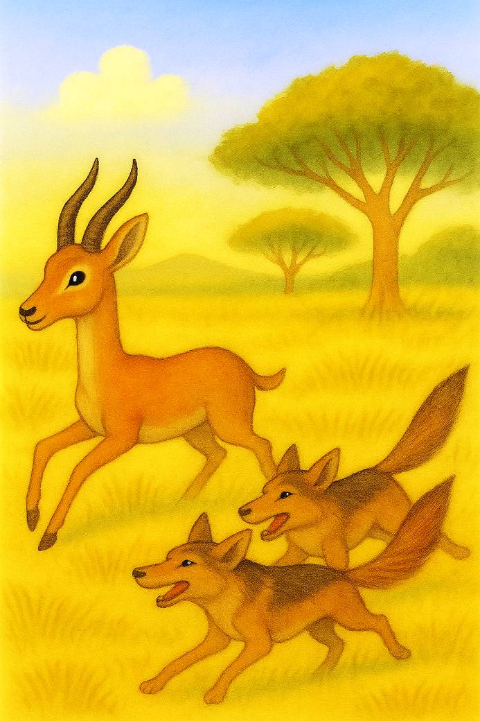 Рассердились шакалы, схватили антилопу и потащили к хозяину. По дороге устали и решили отдохнуть. Привязали они Зу-зу к дереву, а сами спать улеглись. А тут, откуда ни возьмись, любопытная гиена Ги-га появилась и давай антилопу расспрашивать.