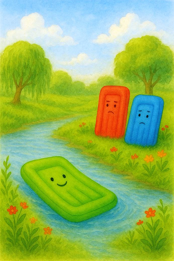 На песчаном берегу тихой речки расположилась пестрая семейка. Папа – большой синий надувной матрас, мама – ярко красный, поменьше и сынок – маленький, зелененький матрасик.